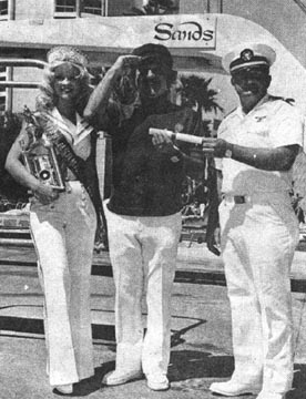 Las Vegas Review Journal 25AUG74 Comedian Dave Barry (center) currently appearing with Wayne Newton at the Sands, received a certificate of honor for his participation as emcee in the recent "Miss Mermaid" beauty pageant. The event was held at the Boulevard Shopping Center in conjunction with National Safe Boating Week sponsored by the Coastguard(sic). Making the presentation was pretty Debbie Worthem, winner of the contest, and Ballard Atwood, chairman of the program.