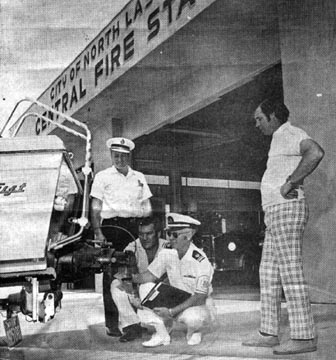 North Las Vegas Valley Times 28MAY74 Check that barge...Robert Buck, Coast Guard Director of Public Education, checks the motor on a boat while Fire Chief Sid Body; standing left, and Fireman Chris Baca, kneeling center, observe. Also looking on is William Smithies, standing right, recreation leader with the North Las Vegas Recreation Department. These three agencies have joined forces this summer to offer three different classes on boating. The first beginning Tuesday, June 4, and deals with sailing. Wednesday, June 5, a class on boating safety and seamanship will begin. A boat safety inspection class begins June 29. These are all certified programs with comprehensive testing at the end of each class.