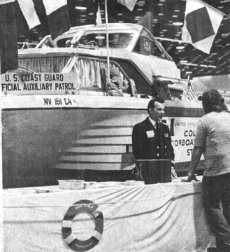 Las Vegas Review-Journal 31MAR74 BOAT SHOW BOOTH - The 1974 Flotilla 91, U.S. Coast Guard Auxiliary booth at the Las Vegas Boat Show was manned by Lou Schlotter, left, Flotilla commander. Booth featured operational vessel, Lyn Nan, owned by Keith and Nancy Byer. The ring bouys around the bottom of the booth denote additional operational vessels that are on Lake Mead for boater's protection. |
