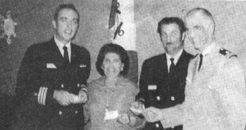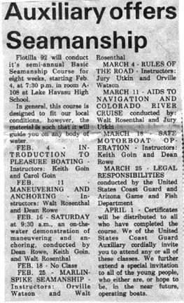 Lake Havasu City Herald 24JAN74 Present at the Change of Command meeting of Coast Guard Auxiliary Flotilla 92 were, from left, Dean Rowe, Membership Training Officer; Rose Brill, Division Secretary; Ron Brill, Division Captain and Past Commander Bob DeQuin.