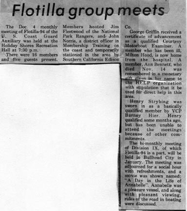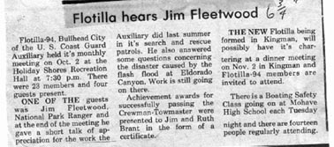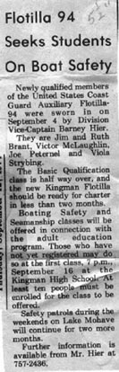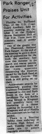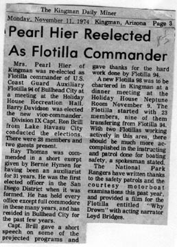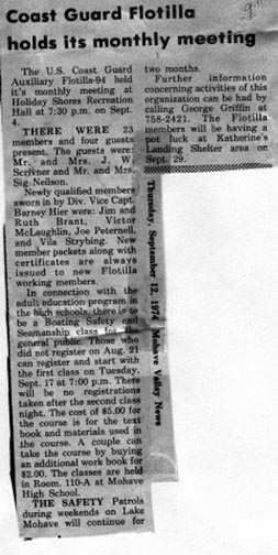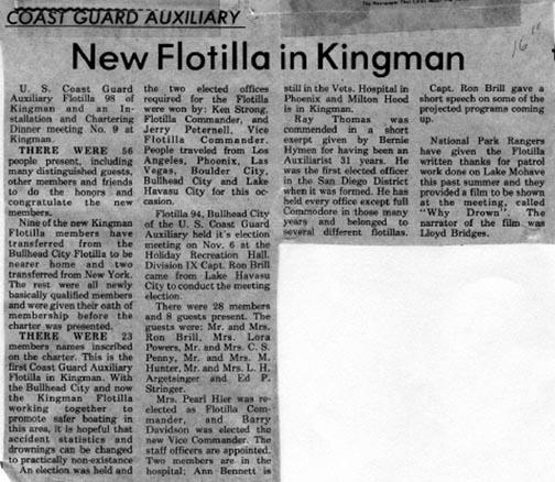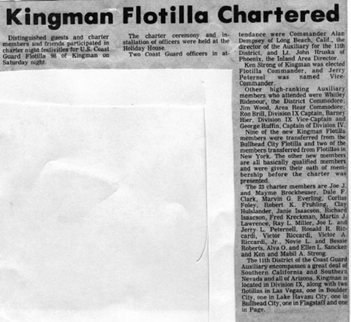 Kingman Daily Miner 12NOV74 U.S. Coast Guard Auxiliary Flotilla 98 of Kingman has been officially chartered. Ken Strong of Kingman, center, newly elected Flotilla Commander, accepted the charter from Lt. John Hruska of Phoenix, the Inland Area Director. From the left, Jim Wood of Las Vegas, Area Rear Commodore; Whitley Ridenour of Redondo Beach, Calif., District Commodore; Commander Alan Dempsey of Long Beach, Calif., Director of Auxiliary for the 11th District; Strong and Lt. Hruska, with charter; Ron Brill of Lake Havasu City, Division IX Captain; and Barney Hier of Kingman, Division IX Vice-Captain.